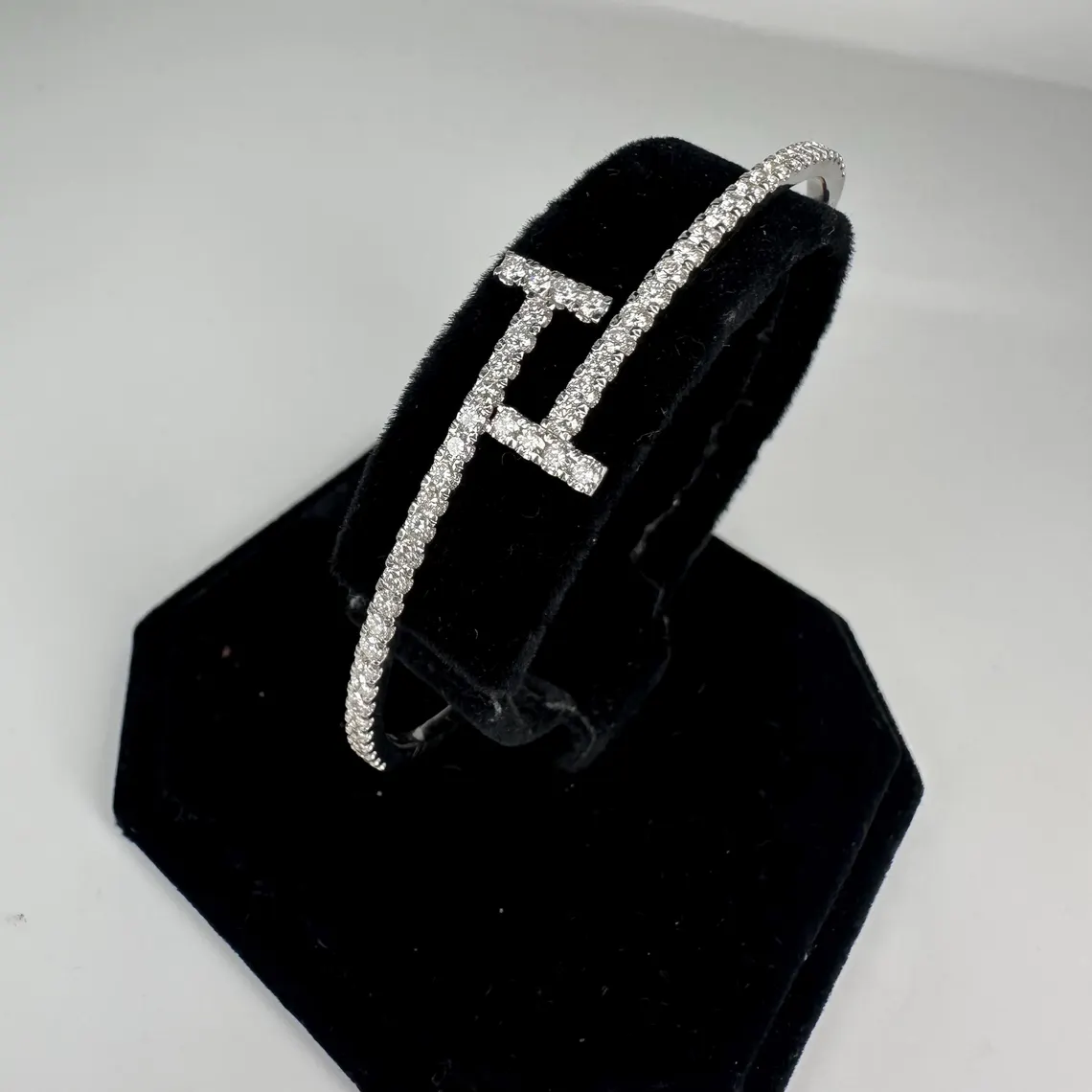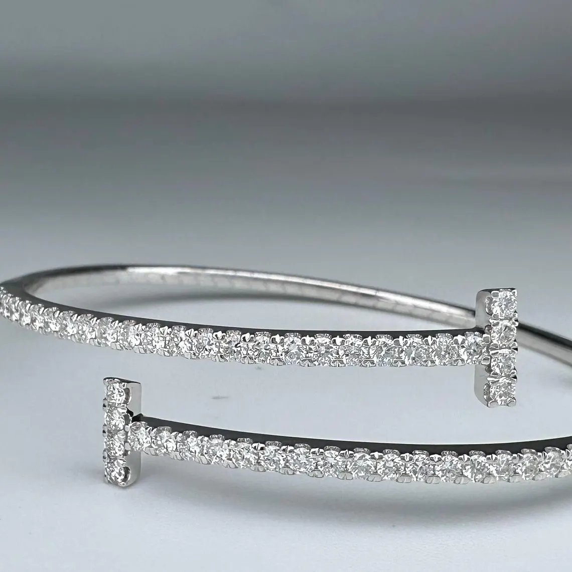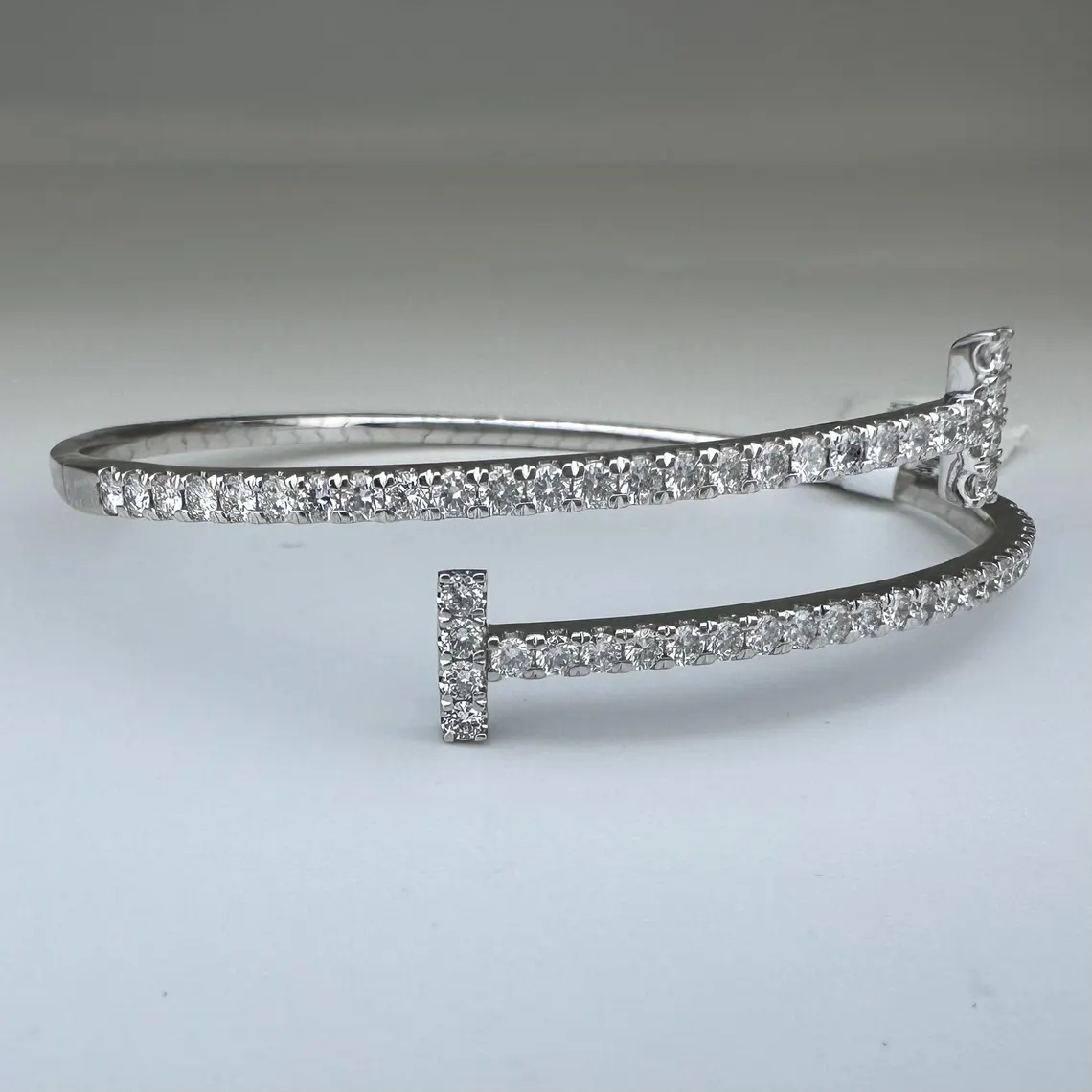 Sophisticated 14KT white gold flexible cuff bracelet showcasing 1.82ct total of round natural near-colorless diamonds (VS2–SI1), delivering timeless elegance with a modern, comfortable fit.