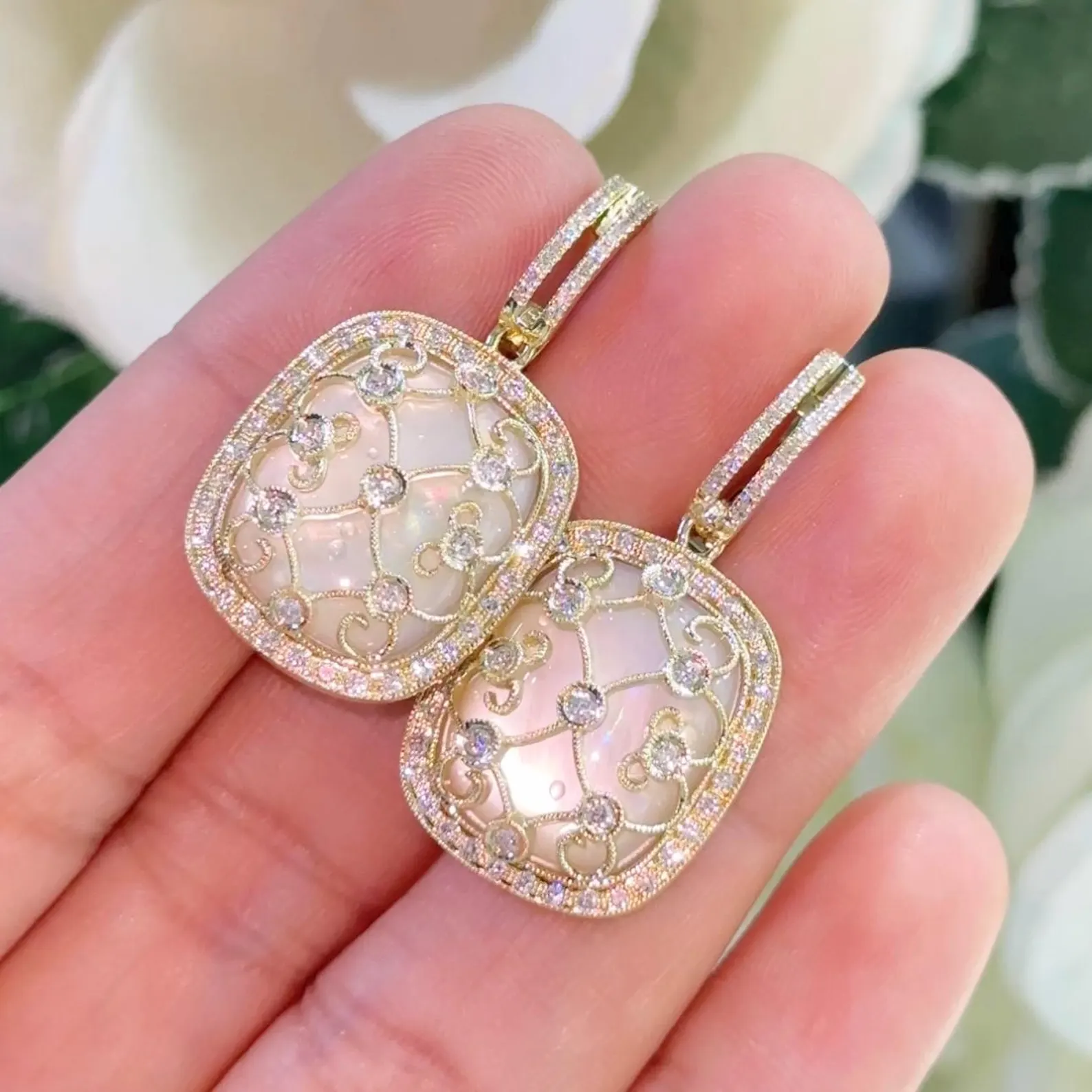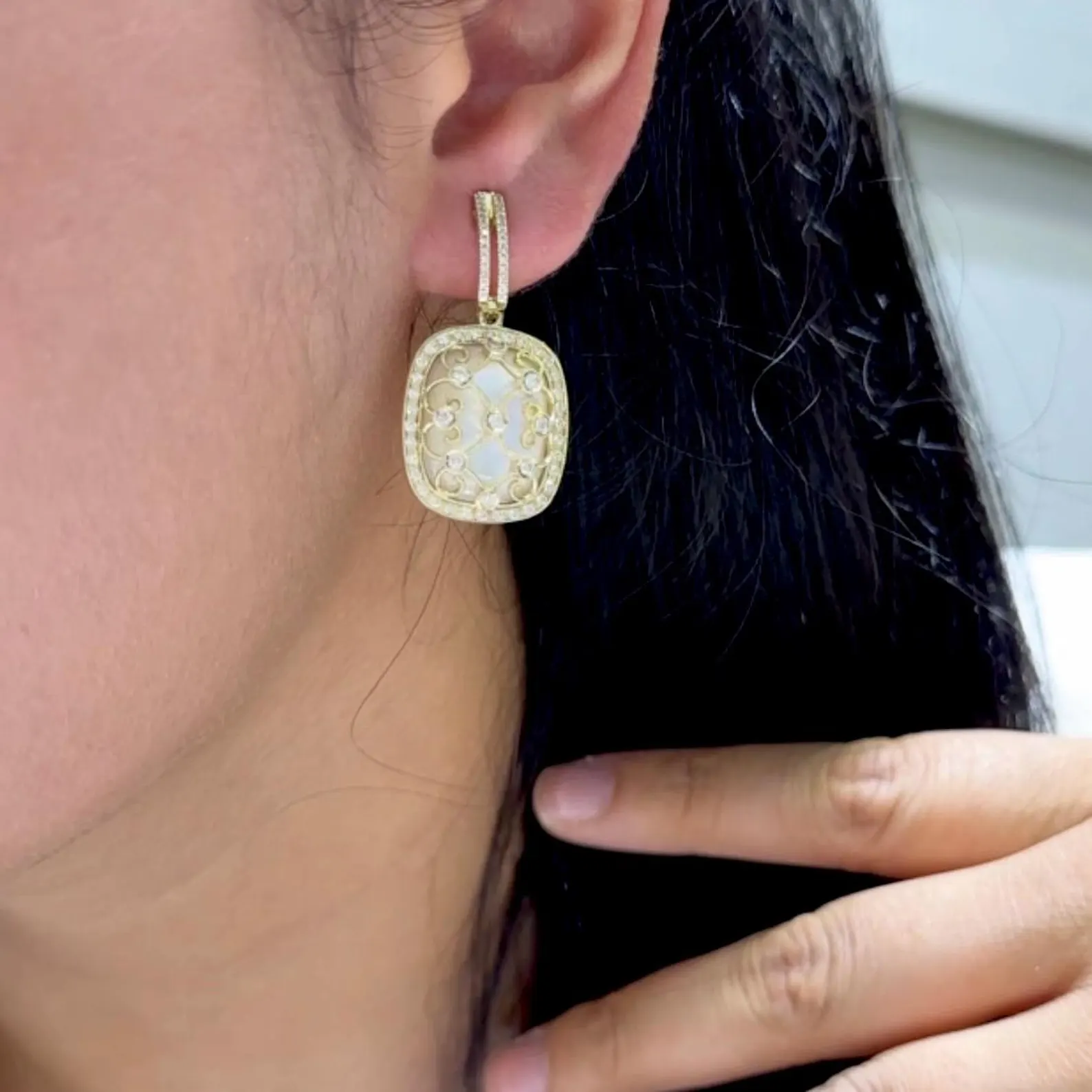 These earrings combine 1.05ct round cut natural diamonds with luminous 13.56ct mother of pearl, all in 14K yellow gold. Perfect for an elegant look.