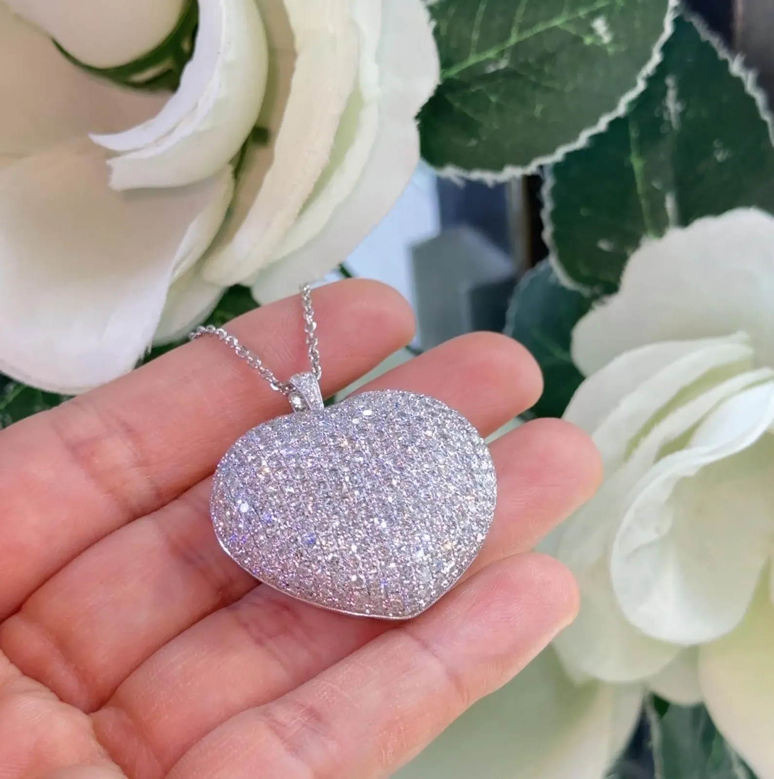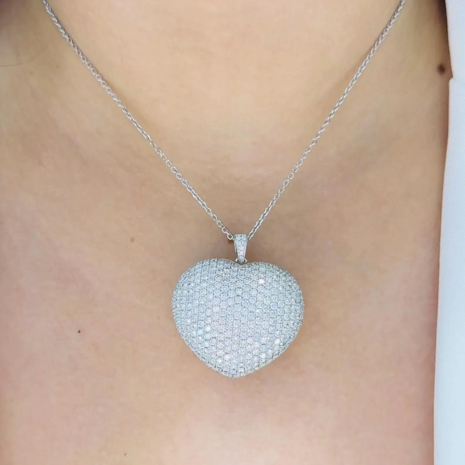 Romantic and radiant, this 18K white gold heart pendant features 8.40ct round cut natural diamonds with VS2 clarity, F-G color. Perfect as a meaningful gift.