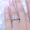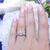 Three stone engagement ring with a very unique look. All three stones are G SI1, the two ovals total 0.60cts, and the center pear is 0.83cts, for a total ring carat weight of 1.43cts. This ring is special because it is very difficult to match stones of different shapes with the same color and clarity. All jewelry sales come with an appraisal including replacement value. Rings will be sized according to costumer request.